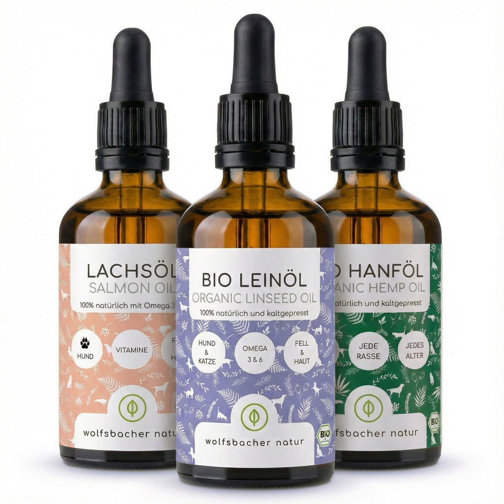 - KALTGEPRESST, NATÜRLICH & PRAKTISCH IM SET: Alle Öle (außer Lachsöl) sind bio und kaltgepresst – frei von Zusätzen, einfach zu dosieren und perfekt kombinierbar für deine Fütterungsroutine.