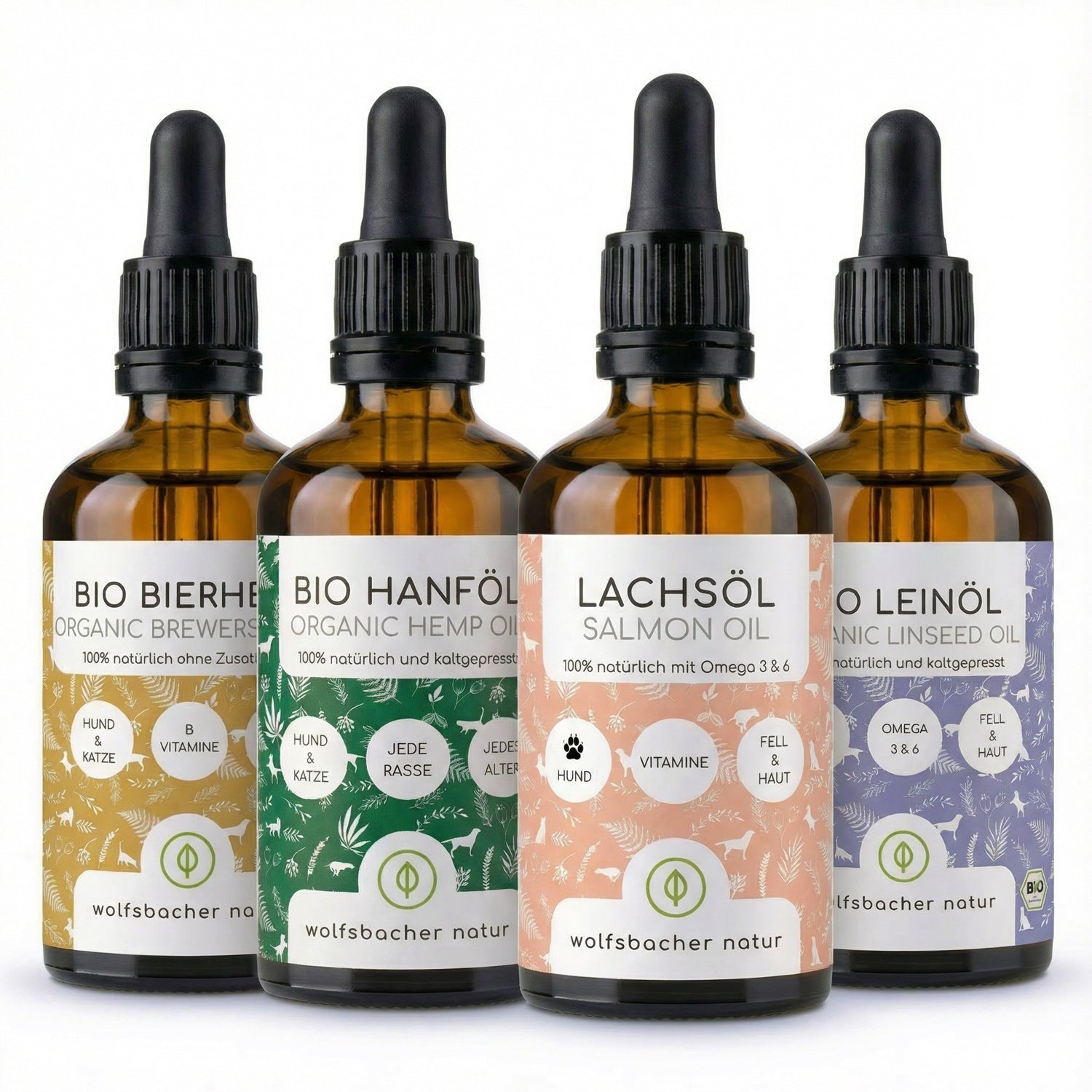4er Bundle Öle 100ml: Lachsöl, Leinöl, Hanföl & Bierhefe