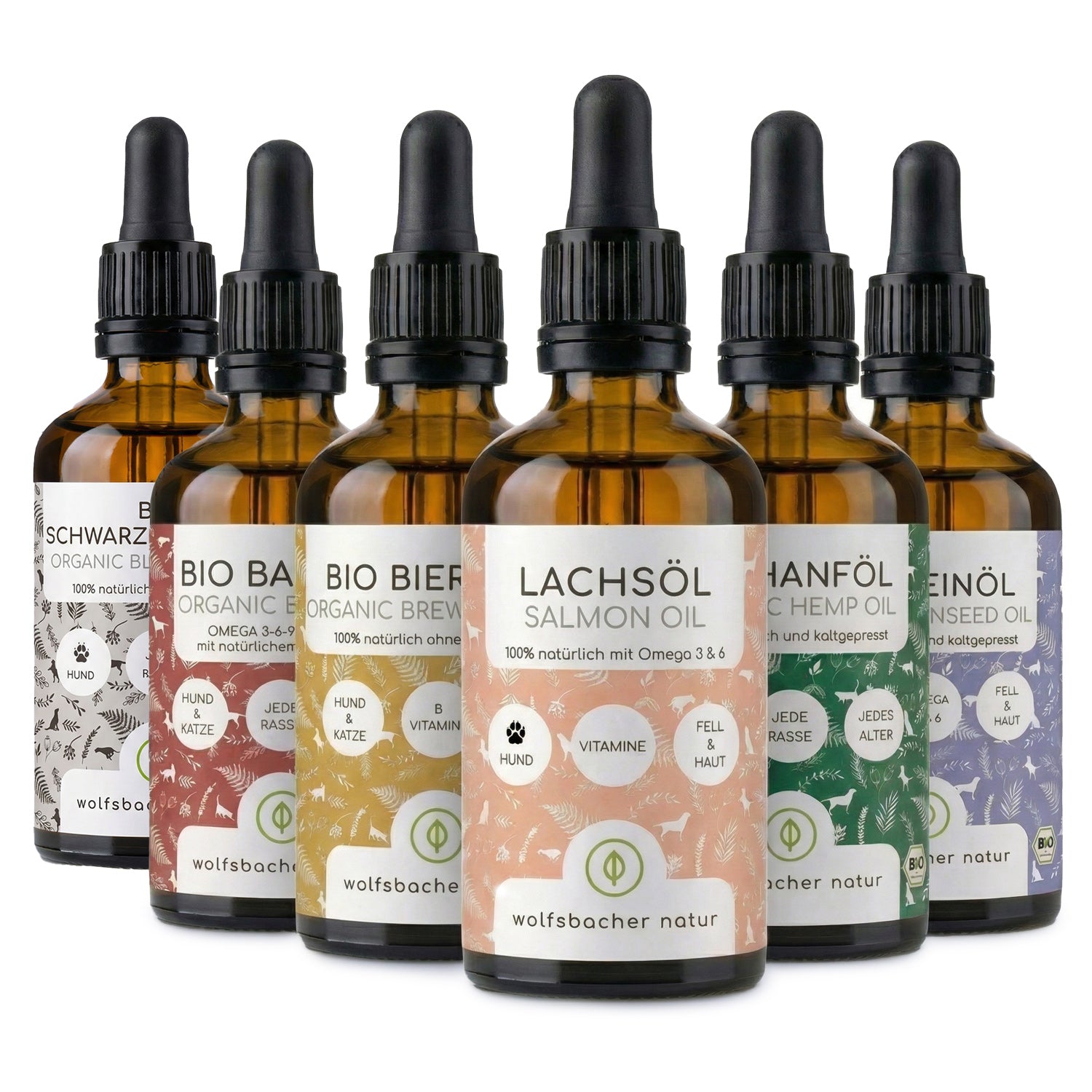 6er Bundle Öle 100ml: Lachsöl, Leinöl, Hanföl, Bierhefe, Schwarzkümmelöl & Barföl